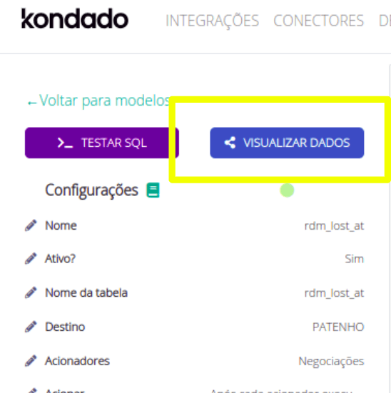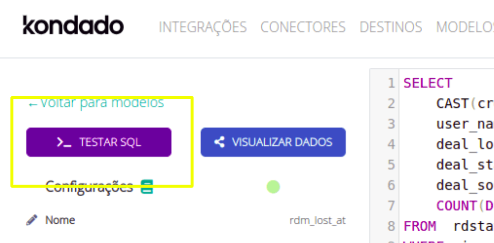 Para testar seu SQL, primeiro selecione um destino do tipo Via Kondado e, então você verá o botão TESTAR SQL. Basta clicar nele. Você pode também utilizar o atalho CTRL+ENTER