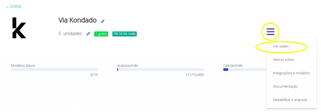 Após seu período de teste grátis, você pode ter quantas instâncias de Via Kondado quiser, cada um conterá seus próprios dados e terá seu próprio token de acesso. Para criar um novo destino, basta clicar em "Criar+" na barra superior, escolher Via Kondado, dar um nome e um número de unidades ao novo destino