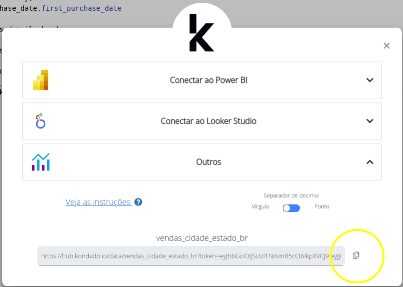 A conexão com o Via Kondado é realizada via API. Você poderá obter facilmente o link de acesso API para qualquer tabela, de maneira similar ao modal abaixo. Você poderá alterar o separador de decimal entre vírgula e ponto e então clicar no ícone de copiar para obter o link