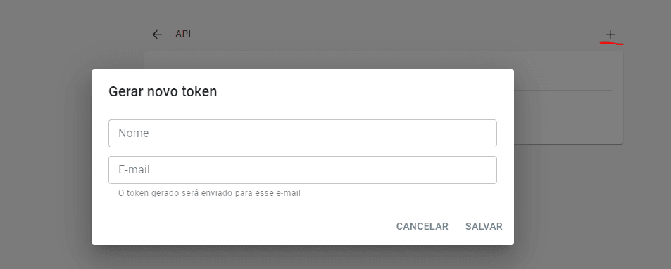2) Após o login, vá em Admin>Configurações>Integrações>API> símbolo de + (Gerar token). Isso irá gerar um pop-up conforme abaixo: